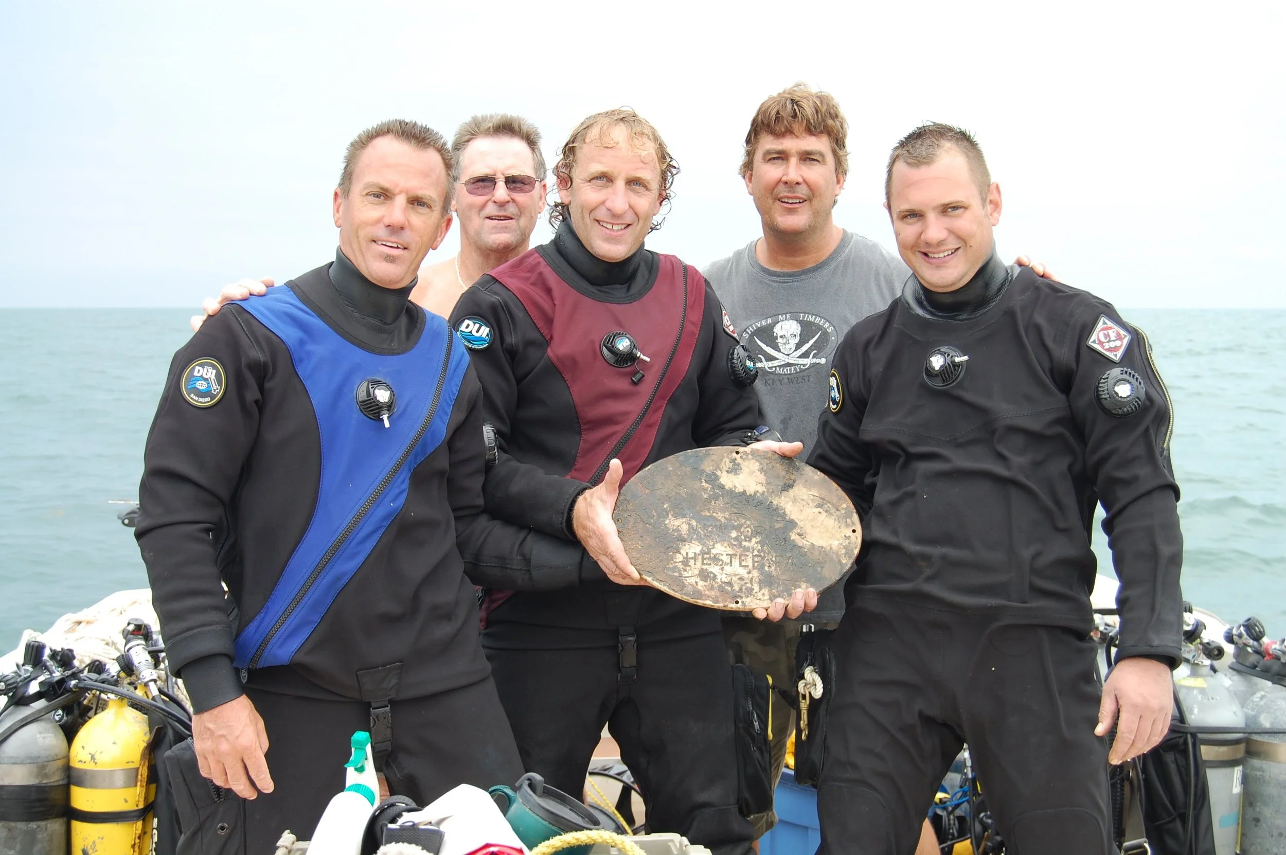 SS Manhattan builders plaque recovered August 2009. Tim Terrey, Bart Malone, Rusty Cassway, Brian Sullivan and Andrew Nagle.